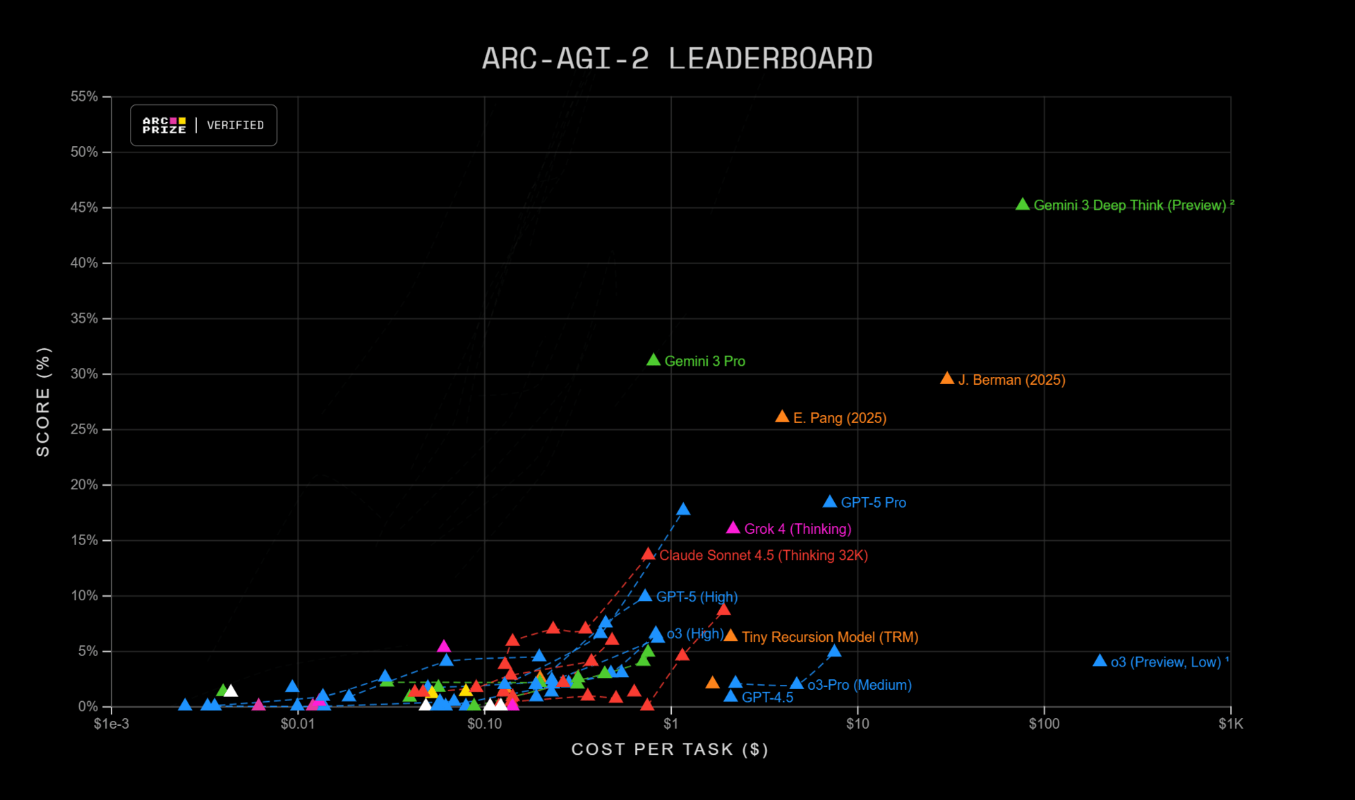 Look at the new ARV-AGI-2 benchmark Leaderboard. True Artificial General Intelligence will be achieved if a model scores between 50-55% on the benchmark for the cost of fractions of a cent. The Y-axis shows the percentage score , the X-axis shows the cost per task in $. Look at where Gemini 3 is. If they’re able to drive down the cost of the Deep Think model - we’re there.