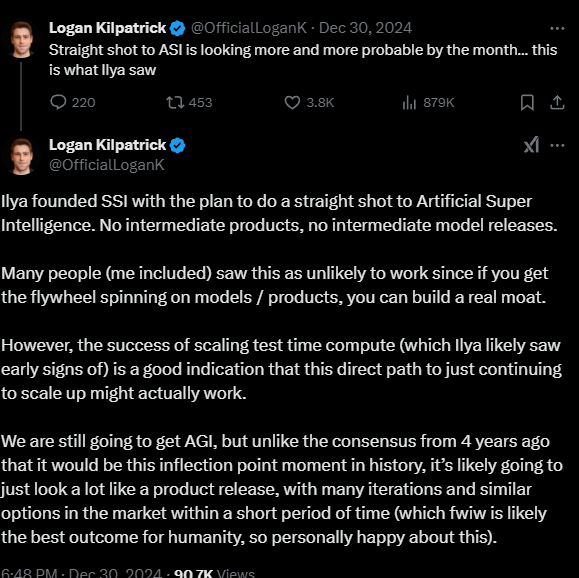 Ilya Sutskever, the AI scientist that has left OpenAI last year to found his own company, SSI (Safe Super Intelligence) is doing a straight shot a superintelligence in his new venture.